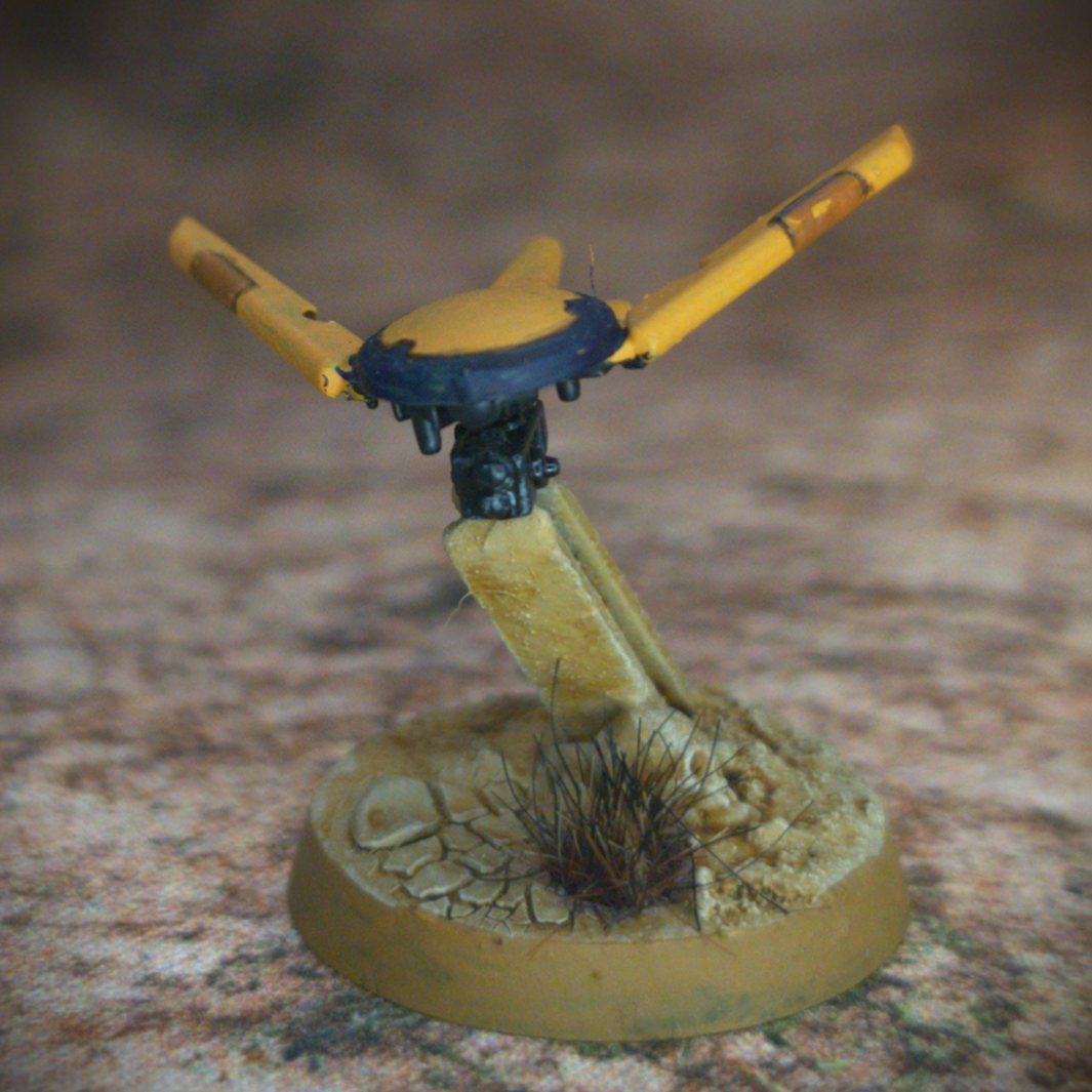Moving onto the weapons and armour, I started by giving them and the topside of the Oversight Drone a couple coats of Two Thin Coats Manticore Ochre. For the working parts of the weapons like the handle and what I assume is the ammo canister, and the underside of the drone for that matter, I painted them with Two Thin Coats Death Reaper. For a bit more variety I painted the grips of the Neutron blasters and the odd panel on the armour with Two Thin Coats Dry Rust Brown. As it’s an accent colour on my Tau forces I painted a few panels and the rim of the Oversight Drone with Vallejo Night Blue. I then painted the small split-dome things on the weapons, I believe in the lore they’re gyrostabilisers, with Scale75 Dwarven Gold. For the Tau Sept symbols on armour of the Shadestrain I started by basecoated them with Army Painter Matt White and then carefully painted the symbol with Army Painter Matt Black. Lastly, I ran a line of Army Painter Dark Tone between the panels to break them up a little and make them a little more visually interesting.