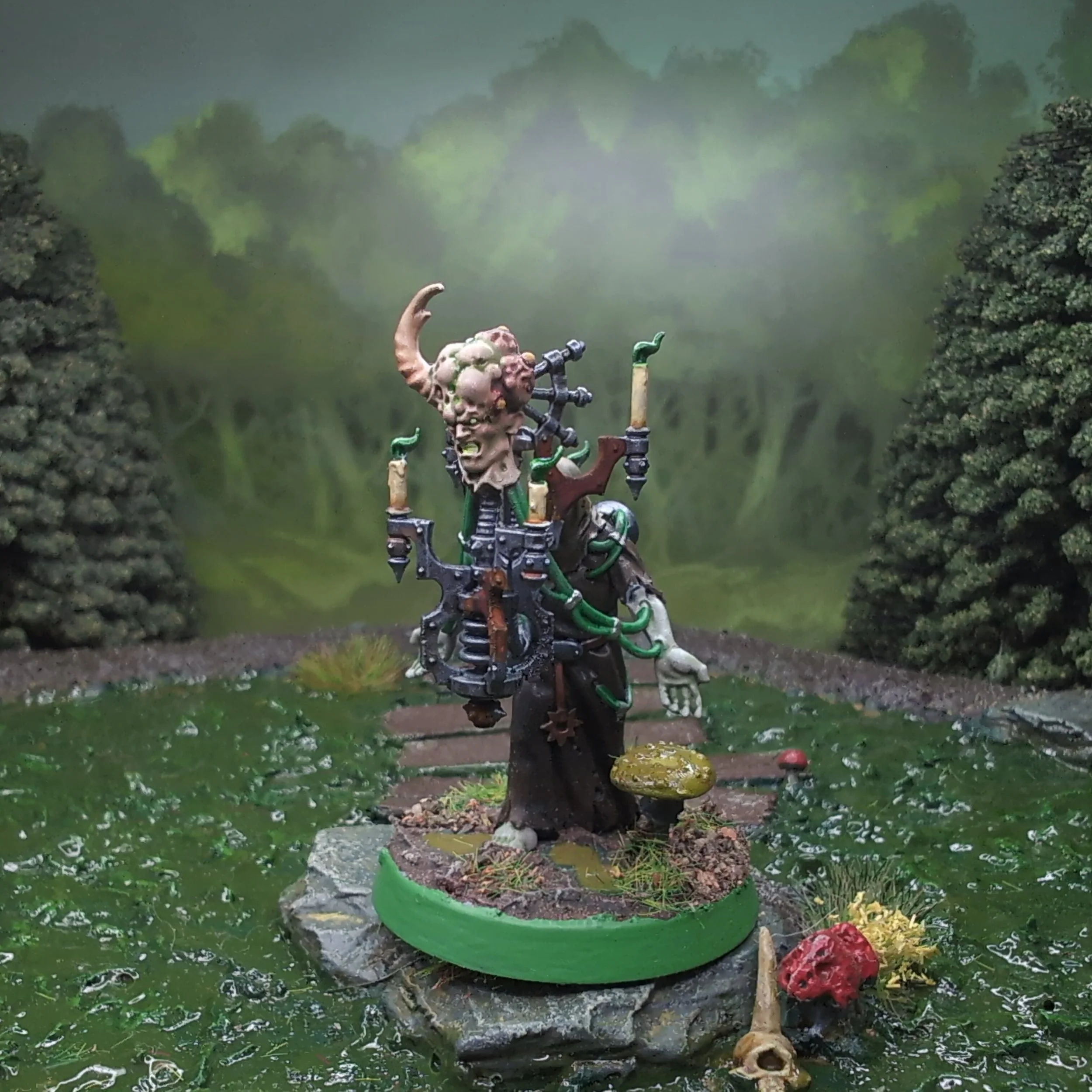 Moving on I painted the robes with Garaghak’s Sewer and the hood with Skeleton Horde. I chose the latter as I imagined being the living host of a severed psyker’s head to be an “honour” amongst the filthy horde, the dishevelled white rag being passed from host to host. Next I painted the contraption holding the head and the electrical devices on the host's waist with Army Painter Broadsword Silver. The belt and strap to the pendant I painted with Skrag Brown, whilst the pendant itself I painted with Balthasar Gold. The tubing leading from the host to the head I painted with Warp Stone Glow, any clips along their length I picked out with Scale75 Thrash Metal. The candles I painted with Vallejo Pale Sand before giving them a wash with Seraphim Sepia. I then painted the flames with Warp Lightning. I finished things off by painting the mushroom with Imperial Fist which thanks to the grey primer became more of a dull lime colour.