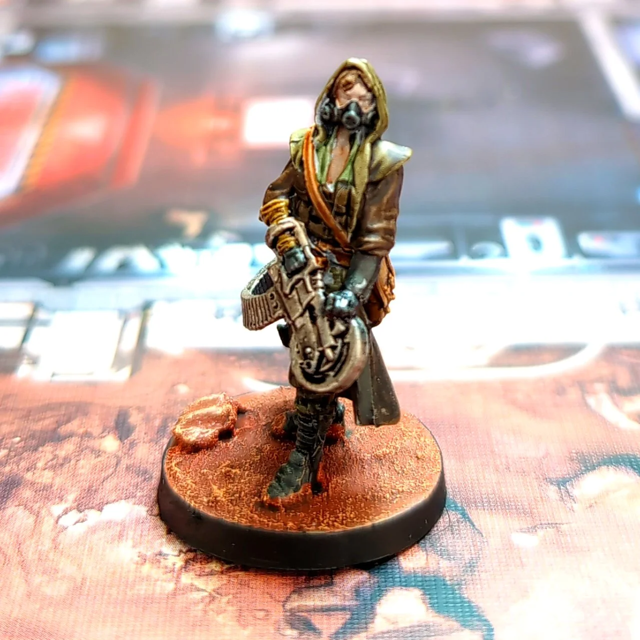 For more specific details I painted Doctor Sydney Hills’ shoulder and knee pads with Creed Camo. And while I had it out I also painted Finn Bartoo’s gasmask with Creed Camo. Their vest I painted with Garaghak’s Sewer. The aprons for Doctors Sydney Hills and Pat Fieser I painted with Skeleton Horde. Doctor Carmen Sunyer’s coat and Finn Bartoo’s jacket I painted with Wyldwood, the hood of the former I painted with Army Painter Desolate Brown. To finish Carmen off I painted her hair with Cygor Brown and gasmask with Black Templar. Doctor Pat Fieser’s hoodie I painted with Militarum Green. For Tuck MacIntyre I painted his apron with Militarum Green and his backpack with Army Painter Speedpaint Desolate Brown.