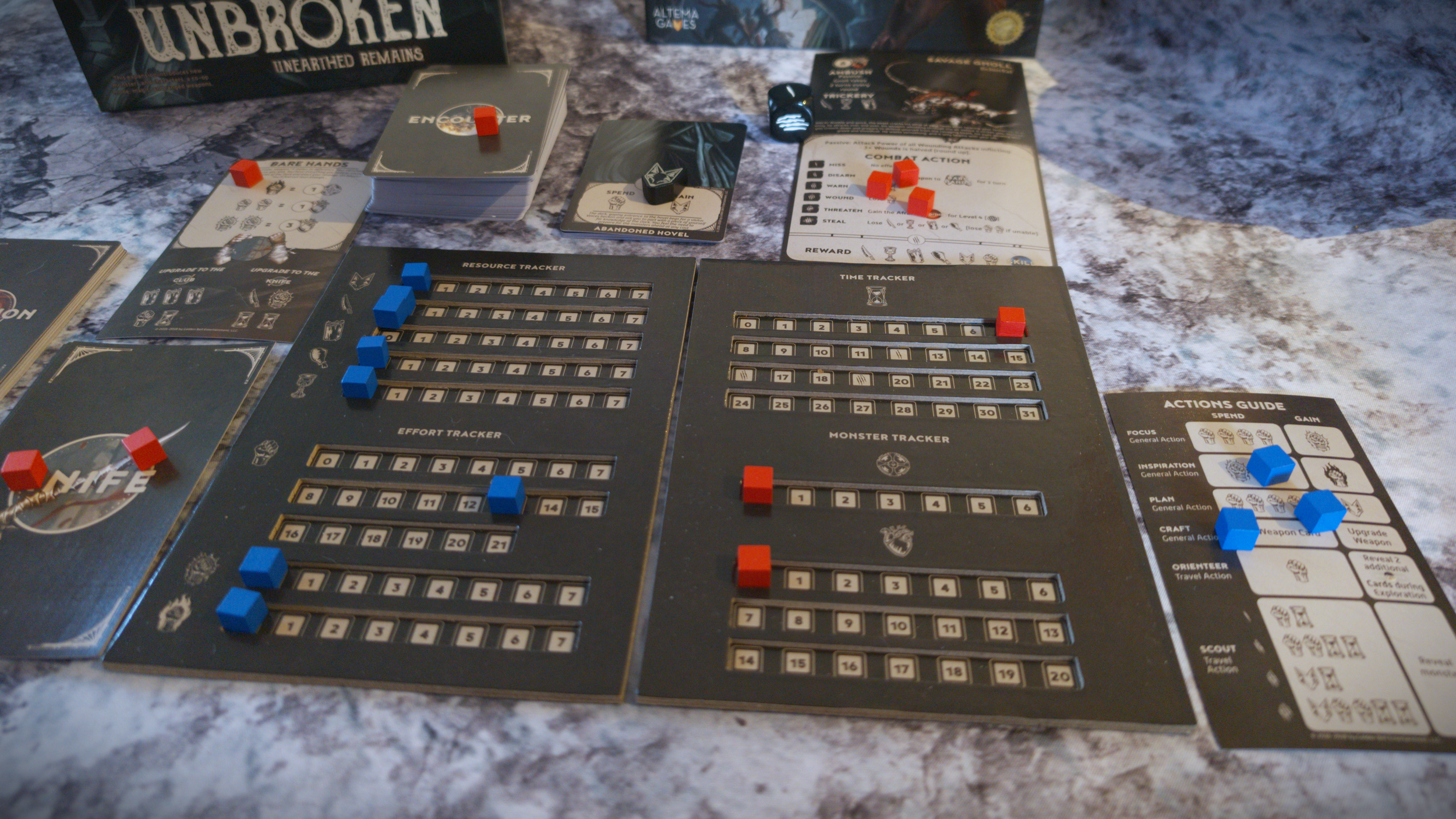 Released in 2018, Unbroken is a solo board game of survival and exploration. Left for dead in the endless tunnels and warrens of The Dark, you must carefully manage your meagre resources if you’re going to have any chance of making out alive. Drawing cards to progress you must make your choices carefully. For each level is guarded by a fearsome monster, spend too long exploring the tunnels and they’ll pounce before you’re ready, forcing you into confrontation. Keep your wits about you however and you might just be able to sneak your way past. Will you make it out, or will you finally fall?